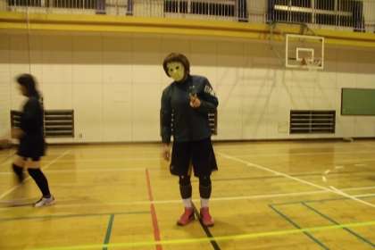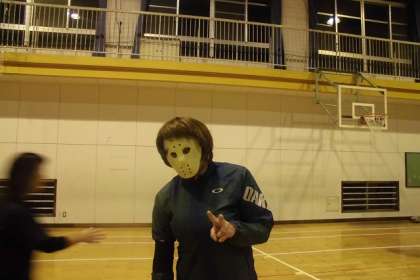 PTA会長がマスクを被り、ムードを盛り上げます♫