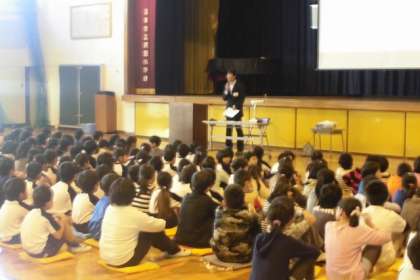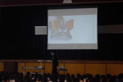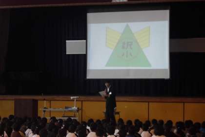スクリーンに、校長先生が作ったプラ板の校章が映し出されます。