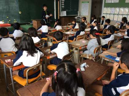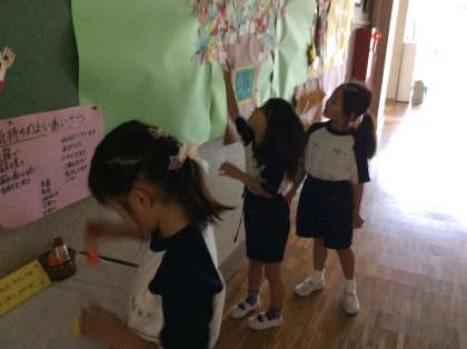 企画委員会の6年生が、笑顔の大木について教えに来てくれました。1年生も元気に取り組んでいます。