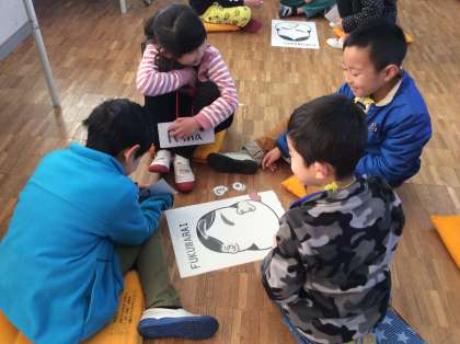 1年生の今日の英語は、英語でふくわらいでした。目隠しした友達に、「アップ!」「ライト!」など英語を使って場所を伝えました。