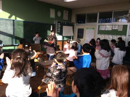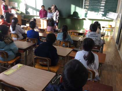 1年生の教室に、企画委員会のお兄さんお姉さんが、新しい企画「ボランティア五十三次」について教えに来てくれました。合い言葉を教えてもらい、楽しそうに真似をして練習していました。