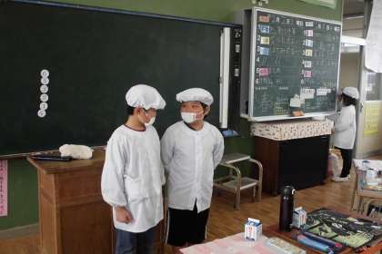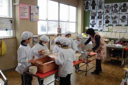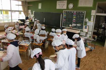 給食係が、配膳する班の指示を出します。