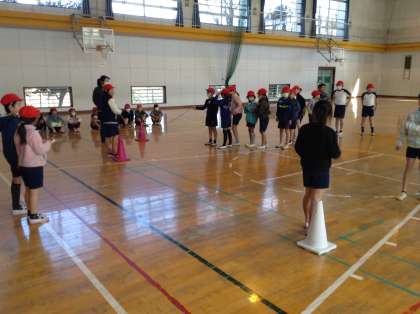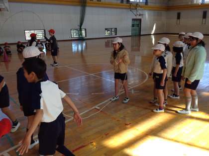 8の字跳びの様子です。「ハイ!ハイ!ハイ!ハイ!」かけ声に合わせてテンポ良く跳んでいきます。子どもたちからは「2分館跳べて嬉しかった。」「負けたけれど楽しかった。」「持久跳びもう一回したい。」という声が聞かれました。