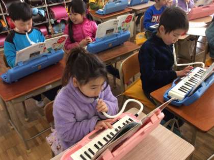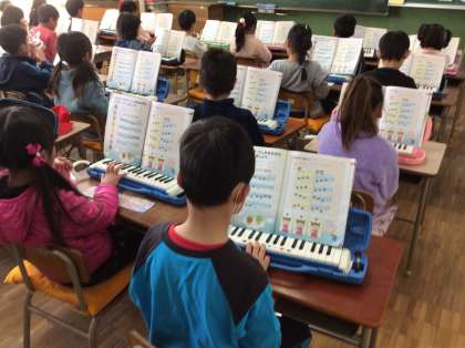 音楽の授業では、色々な楽器の演奏に慣れてきました。パートに分かれての練習も、掛け声を合わせて順調です。