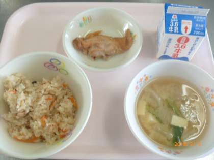 ●ツナとしめじのごはん ●牛乳 ●鶏肉の照り焼き ●里芋と豆腐の味噌汁