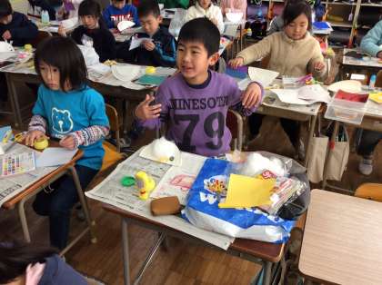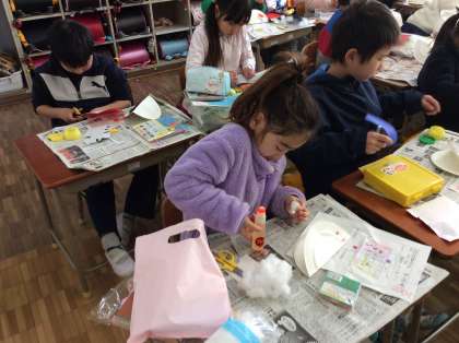 1年生は、図工の授業で「コロコロゆらりん」の作品を作りました。紙皿を半分に折り、コロコロ揺れる姿が何に見えるか想像して飾り付けをします。
