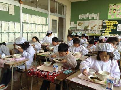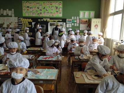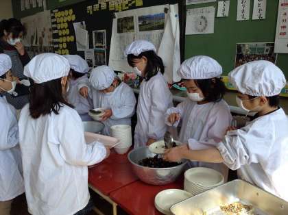 1年生もあと1ヶ月余で2年生になります。4月の頃に比べて、配膳が上手になりました。量を考えながら、盛り付けていきます。待っている人も静かです。