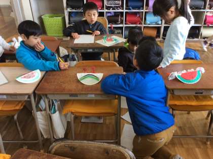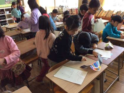 1年生は、図工で作った「コロコロゆらりん」の鑑賞会をしました。友だちに、「これは何?」と聞いたり、いいところを伝え合ったりします。2組の様子です。