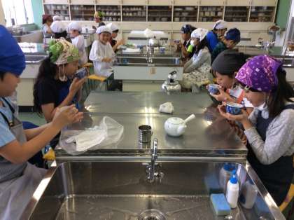 5年生は、家庭科で初めての調理実習「お茶を入れよう」に取り組んでいます。ガスコンロに火を付けるのがちょっぴりこわい、お茶が思ったより苦い、など色々な体験をしています。