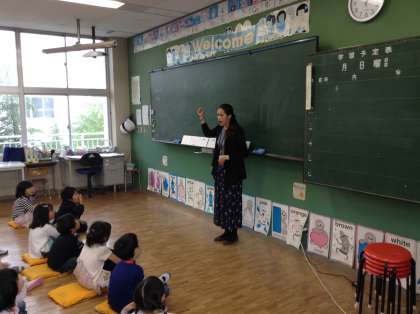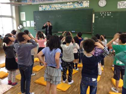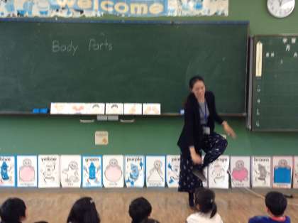 英語の授業で、体について教えてもらいました。ALTのジェニー先生が見せてくれるお手本をよく見て真似します。歌を歌ったり、英語のゲームをしたり楽しく学習することが出来ました。