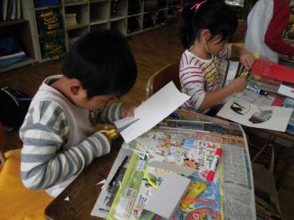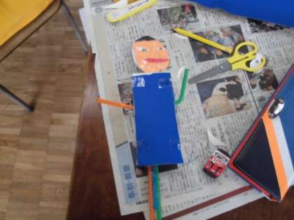 ストローの素材を活用して可動式の立体作品に取り組んでいます。なかなか巧みに政策が進んでいます。「図工大好き!」と表情に表れていますね。
