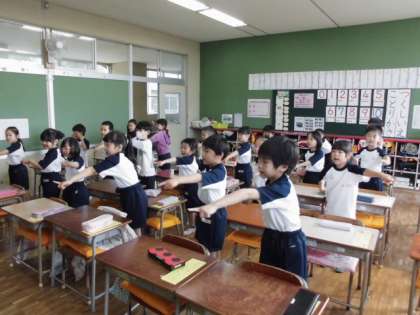 こちらは1年生。朝の会の短い時間を使ってダンスの練習です。