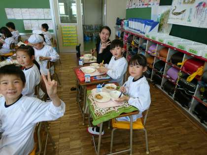 給食の時間に、ALTのジェニー先生が来てくれました。