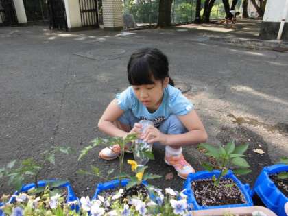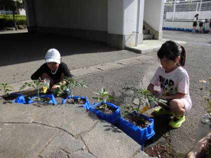 夏野菜のお世話です。ミニトマトやなす、ピーマンなどが育てられています。お世話を頑張っています!収穫が楽しみですね。