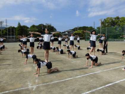 5,6年生 表現「英雄〜ヒーロー〜」の練習風景です。真剣な表情で集中して取り組んでいます。