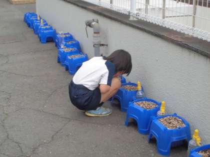 自分の鉢をじっと見つめています。芽が出るのが楽しみなんですね。