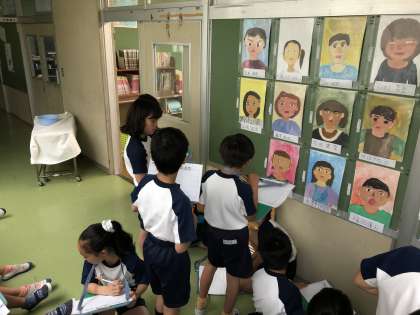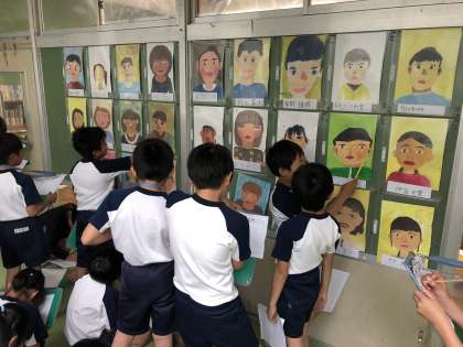 子どもたちは、廊下に飾られている友達の作品の良さを見つけています。有名な画家の作品でなく、友達の作品という設定が素晴らしいですね。まさに友達を認める活動と言えます。