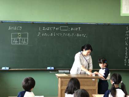 数の分解や合成の学習です。決められた数から友達にわからないようにいくつかを取ります。残ったおはじきの数から、取った数を考えます。足し算、引き算の学習につながっていく大切な学習です。