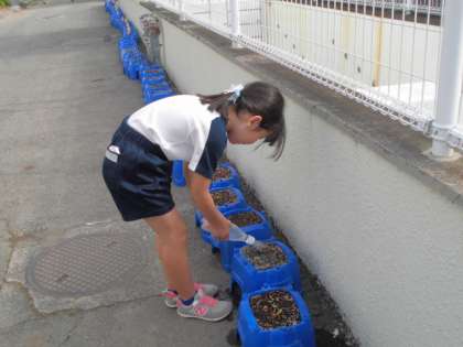 3年生の栽培活動の鉢を見ると、小さな芽が顔を出していました。お世話に一層力が入りますね。