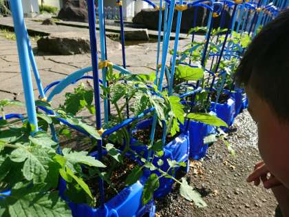土曜日に倒れてしまったミニトマトに、支柱をたててあげました。