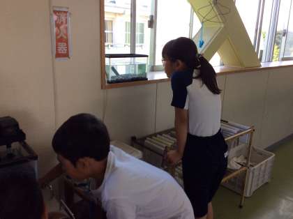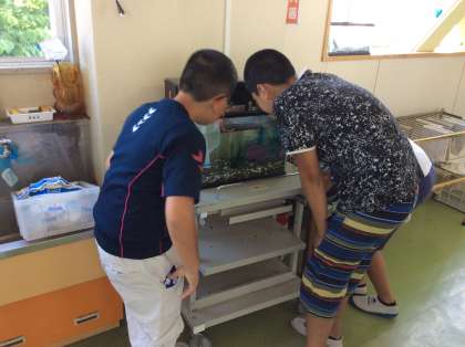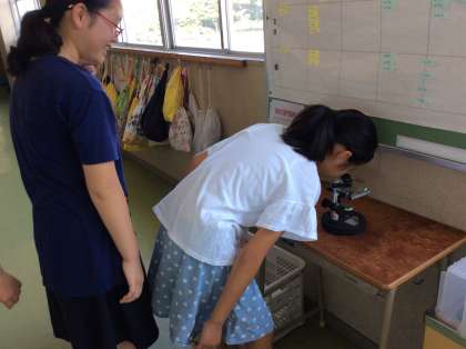 5年生は理科で「メダカのたんじょう」を学習しています。それに併せて、5年生の廊下ではメダカを育てています。顕微鏡で卵の中をのぞいて2つのつぶらな瞳を見たり、赤ちゃんの様子を見たり、興味津々です。