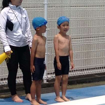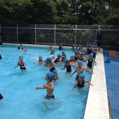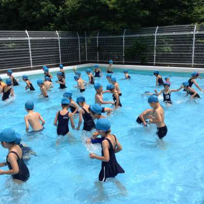 「たからもの拾い」では、潜って水中の様々な形を拾ったり、「洗濯機」では、プールの中をぐるぐる回りました。みんな、よい笑顔が見られました。