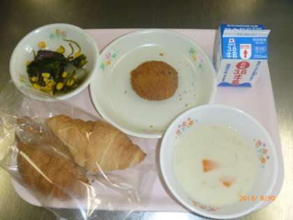 ・クロワッサン ・牛乳 ・キャベツメンチカツ ・海草サラダ ・クラムチャウダー