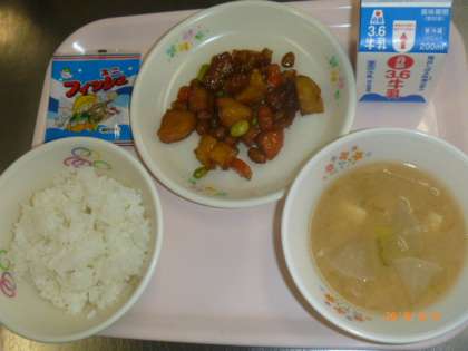 ・ご飯 ・牛乳 ・鶏肉とじゃが芋の揚げ煮 ・豆腐のみそ汁 ・アーモンド小魚