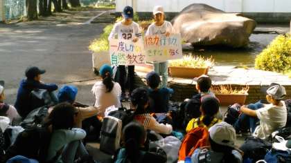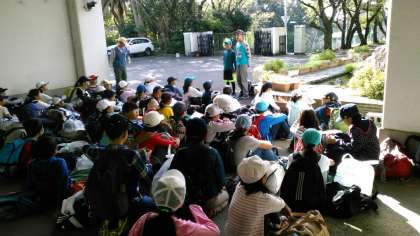 5年生が今日から2日間、自然教室に出発します。出発式が終わりいよいよ桃沢に向かいます。