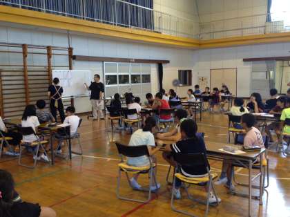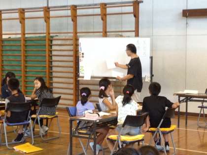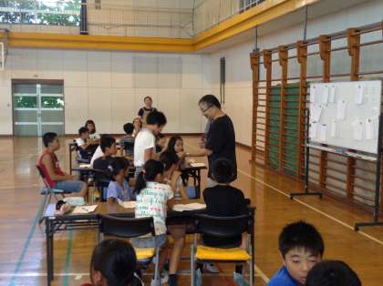 5年生は、俳句の授業です。4人1組になり、一人一文字書いて、次の人に回していきます。1度目は、うまく俳句の形にならなかった班も、杉山さんのアドバイスのおかげで、2度目はレベルアップしていました。