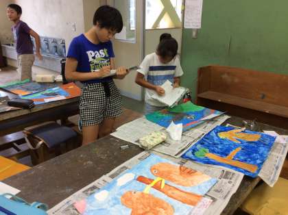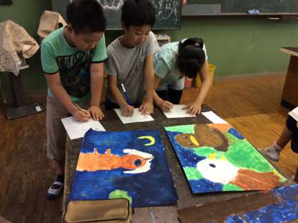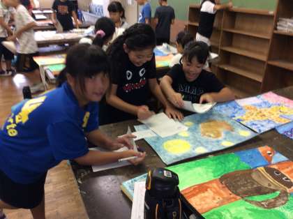 5年生の図工「お話の絵」が仕上がりました。1組は「よだかの星」2組は「銀河鉄道の夜」です。仕上がった絵を見合って、クラスで鑑賞会を行いました。