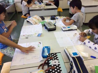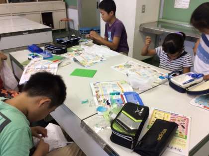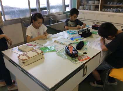 5年生は家庭科で「レッツソーイング、ボタン付け」に挑戦しています。二つ穴、四つ穴、いろいろなボタンを頑張って付けています。