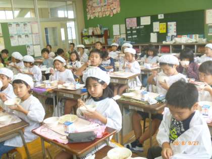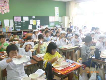 3年2組は最初は班ごとでわいわい楽しく食べていましたが、終わりの時間に近づくと前を向いて真剣に食べ始めます。とても落ちついて食べていました。