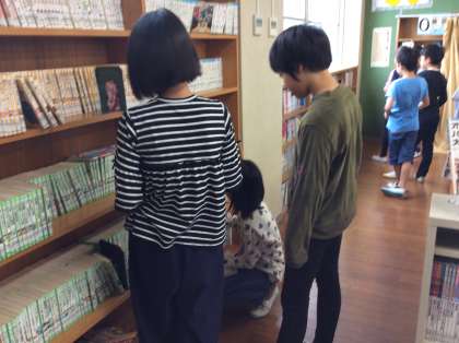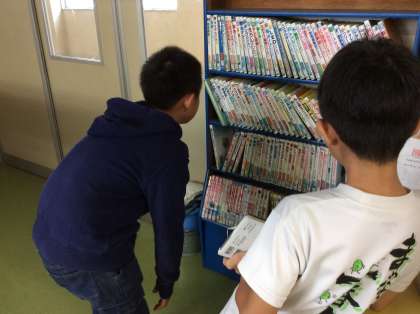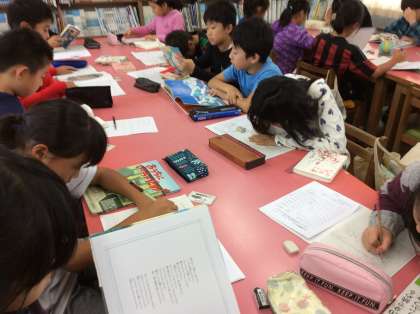10月にあるペア読書の一環であるミニビブリオバトルに向けて、本を探し始めました。ペアの3年生がどんな本が好きか、司書の先生に相談しながら本を選んでいました。