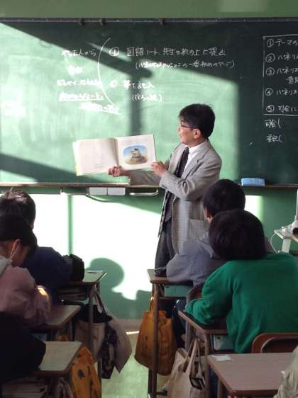 今日の先生方の読み聞かせは、各クラスの代表がくじで選んだ先生がぞれぞれのクラスにきて読み聞かせをしました。