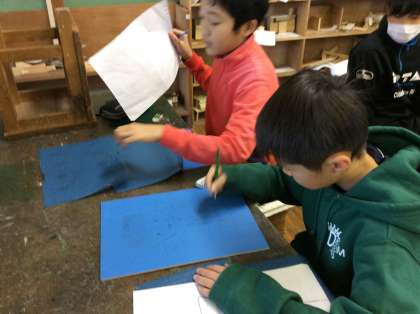 5年生は図工の学習で、彫刻刀を扱います。4年生の時に使いましたが、久しぶりなので、楽しみにしています。今は板に下書きをしています。