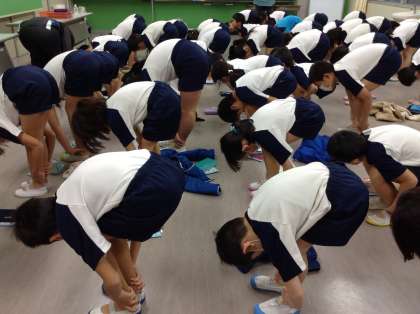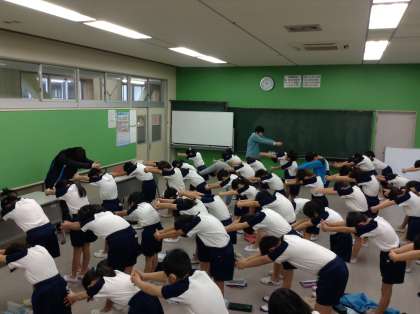 今度は実際にやってみます。ストレッチをやった後は、友達と姿勢を確認します。