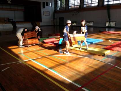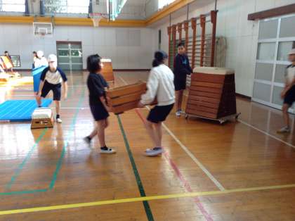 5年生は体育で「とび箱」の学習をしています。今日は開脚跳びだけでなく、台上前転にも挑戦しました。うまく前転できても、着地でしりもちをついてしまう子もいました。練習を重ねていきます。片付けや準備が早いです。