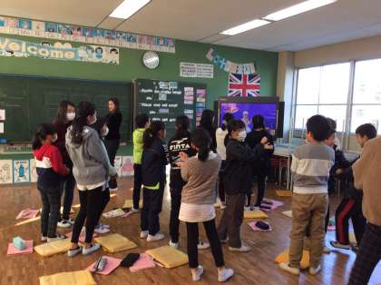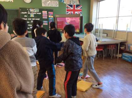5年生の今日の英語は、「場所」の言い方についてでした。行きたい場所までの道順を説明する言い方を学習しました。