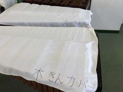 できた物に「鉄琴カバー」「木きんカバー」を書き込み、音楽室の木琴と鉄琴にかけました。