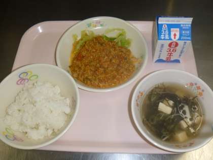 ・ごはん ・牛乳 ・タコライス ・ボイルドキャベツ ・もずくスープ