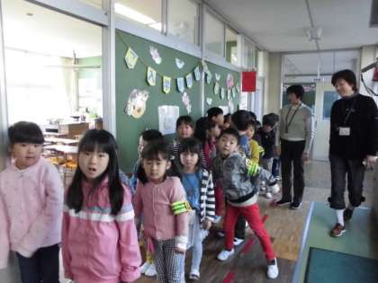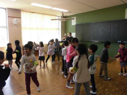 学級づくりの一環として、ゲームをしています。みんな楽しそうです。遊ぶだけでなく、2列にしっかり並ぶことができます。さすがです。