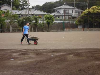 昨日の雨のため、ラインが消えてしまいました。朝から若手の先生を中心に、グランドを整備しています。