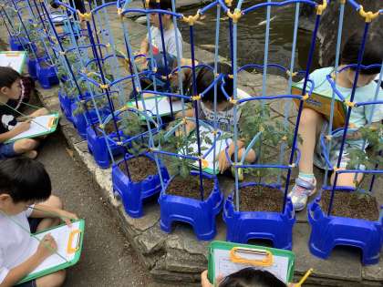 ミニトマト、なす、ピーマンの中で好きな野菜を選んで、苗を植えました。お世話をして、生活科の時間に観察しています。おいしい野菜が育つといいですね。