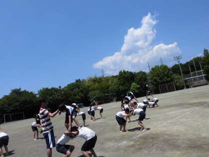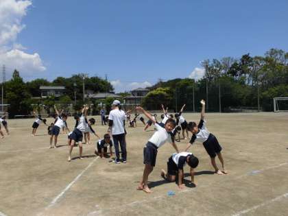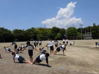 5年生は、初めての組み体操です。難しい技にも一生懸命取り組んでいます。
