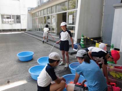 プール掃除の時間を利用して、運動会で使ったビブスを洗濯しています。手洗いです。