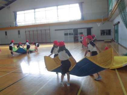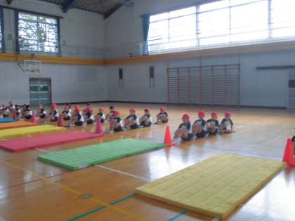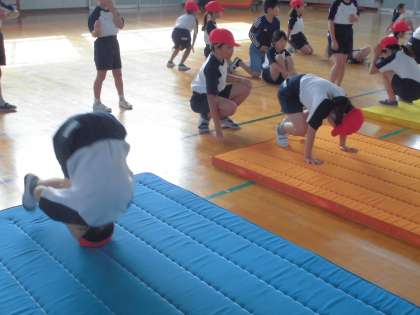 マット運動です。前転・後転の練習をしています。