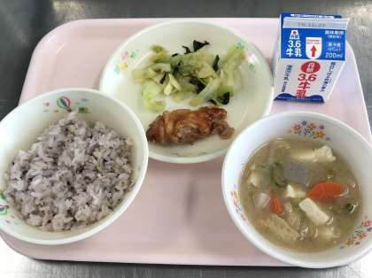 雑穀ごはん 牛乳 鶏の照り焼き キャベツと小松菜の炒め物 みそけんちん汁