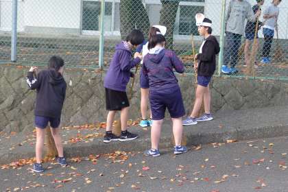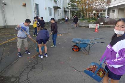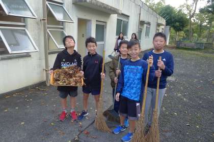 朝からほとんどの子が落ち葉掃きボランティアに参加し、一生懸命取り組んでいました。