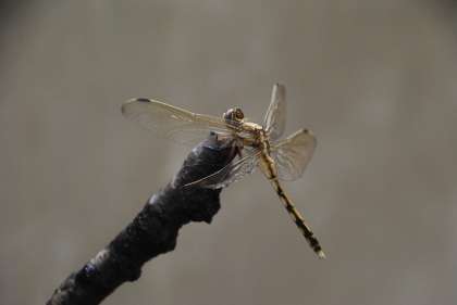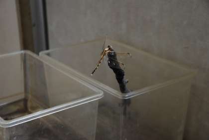 6年生が一生懸命してくれたプール掃除で見つけたヤゴを、職員室前廊下で教諭が飼育していましたが、とうとう羽化しました。シオカラトンボだそうです。シオカラトンボは生まれてこの方「青色」だと思ってきましたが、それは雄で、雌は画像のような色と模様だそうです。インターネットで調べました。新しい学びがありました。